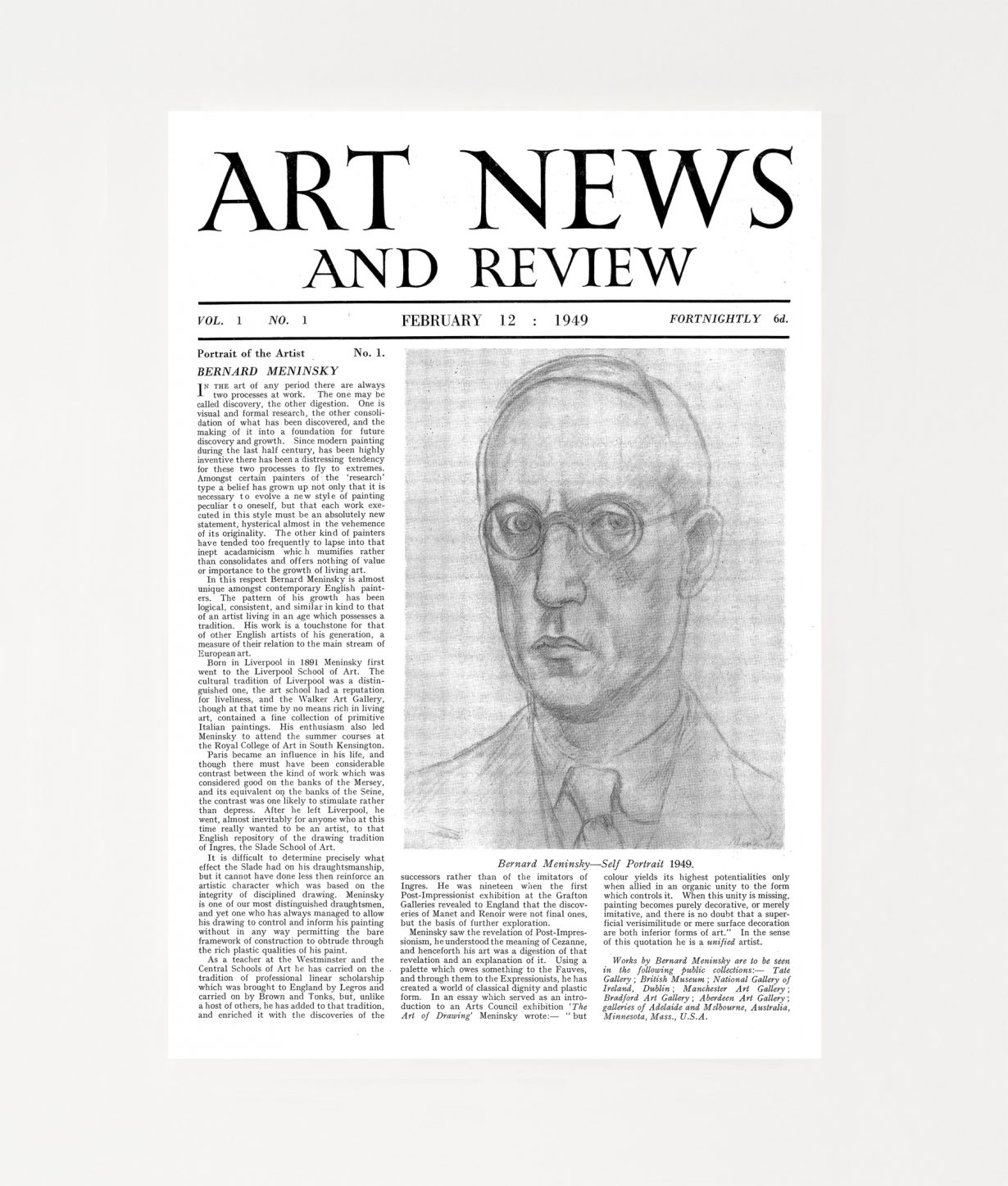「どの時代の芸術にも、常に二つの過程が見いだされる。ひとつは『発見』、もうひとつは『消化』である」。具象画家バーナード・メニンスキーを特集したこの記事は、1949年2月12日付で発行された隔週新聞「Art News and Review」(アメリカの「Art News」と区別するための名称)の創刊号に掲載され、こうした言葉で書き出されている。当時、編集部はメニンスキーに記事の挿絵として自画像の寄稿を依頼している。これは「Portrait of the Artist(画家の肖像)」と題された連載企画で、1950年代を通じて続き、1960年代初頭にも時おり誌面を飾った。このシリーズのうち122点は、1982年にテート・ギャラリー・アーカイブに収蔵され、1989年にはテート美術館で展示されることになった。