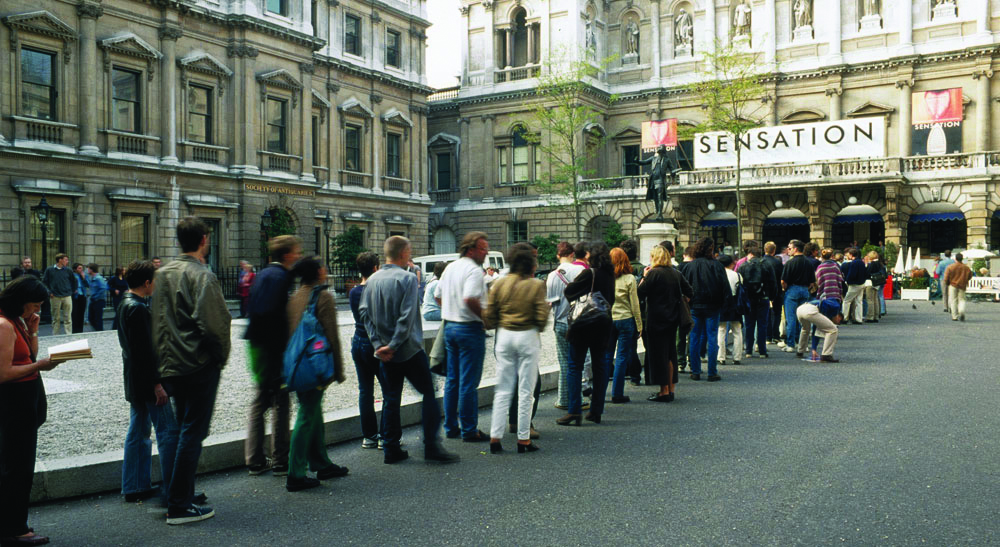 しかし全体として見れば、Art Reviewの編集部は、この新しい世代にあまり好意的ではなかったようだ。1990年代の誌面から浮かび上がるのは、分断された美術界の姿である。多くの人々が「クール・ブリタニア」ブームに乗ろうとする一方で、ヤング・ブリティッシュ・アーティスト(YBA)たちはすぐに、景気後退後のジョン・メージャー政権やトニー・ブレア政権が推進・輸出する文化的ブランドとして位置づけられ、とりわけアーツ・カウンシルやブリティッシュ・カウンシルの助成を受けて広まった。一方で、一部の批評家たちは、大衆的な娯楽や私的な利益のために伝統が犠牲にされつつある現状を嘆いた。さらに、こうした潮流には、本来は歴史的価値や伝統を継承すべき立場にあるはずの美術館やアカデミーなどの機関が加担しているとみなされていた。コラムニストのエドワード・ルーシー=スミスにとって、その象徴的な出来事となったのは1997年――ロイヤル・アカデミーが、YBAの主要な支援者であり広告業界の有力者でもあるコレクター、チャールズ・サーチのコレクションによる展覧会「Sensation」を開催したときだった。