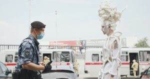 当時松本は「ゲイ・ボーイ」たちが政治的な力を持ち得ると思い、彼女たちを『薔薇の葬列』に配役した。嶋田美子は《突撃!千人針》と《自己決定権 千人針》(どちらも2023)で『薔薇の葬列』や『団地妻 昼下りの情事』と同時代の女性活動家グループ「中ピ連」を題材にしている。中ピ連はピル解禁を訴え、女性の自己決定権を主張し、性と生殖に関する健康と権利を求めた。中ピ連は赤ヘル、ではなく、♀印の書かれたピン・ヘルを纏い直接行動を起こし、ピンクを抵抗の色としての再解釈を促進した。嶋田は油絵の上に刺繍をすることによって、アート(男性性)と工芸(女性性)の二項対立を脱構築した、歴史的フェミニスト・アートにも触れている。