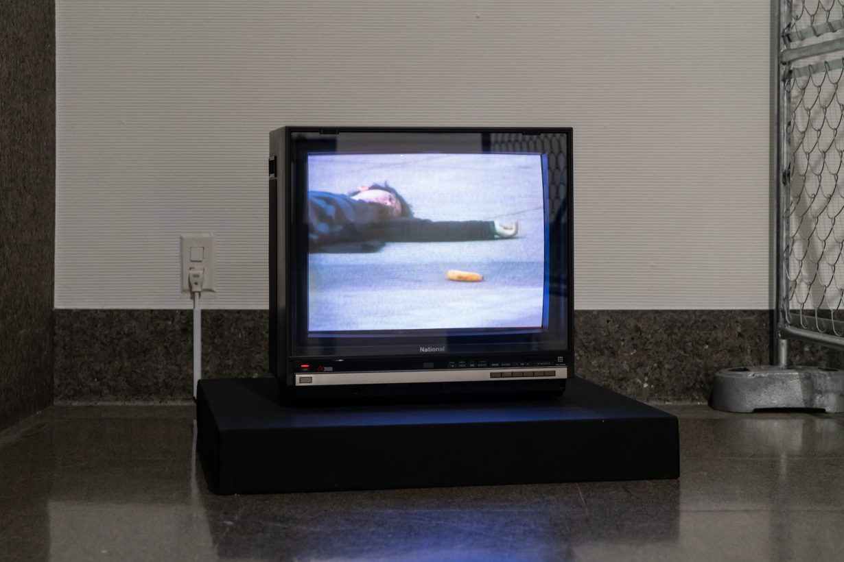 他者への依頼という手法や制作プロセスで起きる偶然性をもあえて採用する荒木の構えは、固定化された属性へと回収されてしまうことへの抵抗の身振りとも読める。文化間の邂逅や摩擦、歴史や語りといった次元を慎重に接続しながら、荒木はひとりの<個>に内在する複数性を、代替可能性を保持しながら展開する。その萌芽を早い時期から示していたのが、荒木が22歳、アメリカで制作した《スーサイド・ピース》だ。ブラウン管モニターを通して示されるのは、ひとりの個の自死だろうか。それは個が疎外されながらも外部の語りに折り畳まれ、出口を失っていく──その臨界で生起してしまう「思想的心中」の瞬間のようにも見える。バナナを銃に見立てるというアイロニカルな紛い者(アウトサイダー)としての姿は、社会において要請される「役割」を主体自身が先回りして引き受けてしまう身振りかもしれない。そのとき、個に内在する複数性は、いつのまにかひとつの像へと固定され、主体の意思から制度的語りへとすり替わっていく。