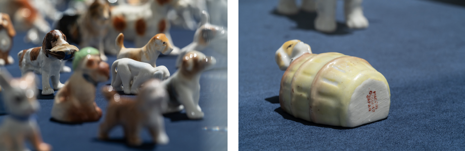 荒木:何でしょうね。本物の犬たちだったら、こんな風に均等に群れないとは思いますが(笑)。今回の展示では特定の方向性を与えすぎないように、放射状にいろいろな方向を向かせています。これには彫刻として、一周回ってみてほしいという意図はありました。一見かわいらしいオブジェのようでいて、裏側にはGHQ占領下の日本で作られたことを示す「Made in Occupied Japan」の印がある。見えているものと見えていないものが両義的に存在している点に着目した作品です。また犬というモチーフそのものも、たとえば戦後の日米関係をめぐっては、「日本はアメリカの犬だ」という比喩的な言い回しが批判的に用いられてきたことや、従属と自立という相反する力学とも重なってくるように感じます。