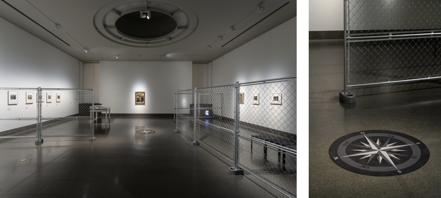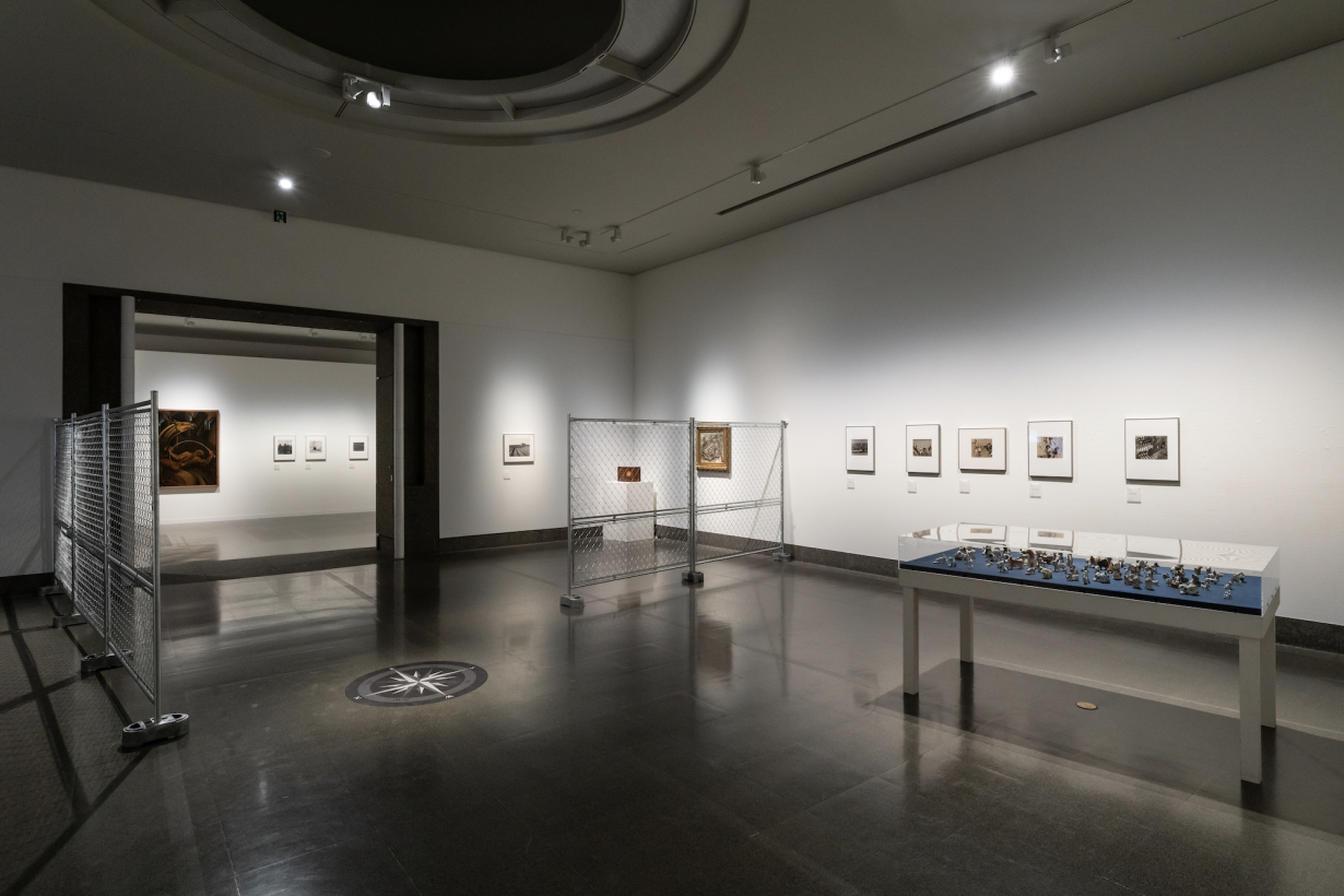 荒木:振り返るとそのようにも思えますが、実際は偶然の連続だったり、現場や条件といった外的要因による影響が大きかったりしますね。まず、展示空間内の天井にあるスカイライトが非常に特徴的で存在感がありました。無視できない大きさで、どうにか活かせないだろうかと下見を終えてからずっと円形について考えていました。結局いいアイディアが出ないまま、私はポーラの在外研修でリスボンへ発つのですが、滞在中に街中でよく目にしたのがコンパスローズや海図のモチーフでした。ポルトガルは大航海時代の海洋帝国で、広場や石畳にそういった意匠がたくさん使われてるんですね。「Reorienting」という言葉を思いついたのも丁度このときで、スカイライトの円形を起点にコンパスローズへと方角に発想が繋がり、展覧会の枠組みを導き出すことができました。さらに、美術館のある京都は碁盤目状の街なわけですが、京都御所を含む平安京は、厳密な真北から少し西へずれているということを知りました。これには諸説ありまして、あえてずらすことで気を回す、という陰陽道的な説もあれば、当時の天文観測機器の精度の限界だったという説もある。その「ずれ」に着目して今度は磁北を調べてもらったところ、現在の京都市全体の軸は磁北から約8度西へずれていることがわかりました。そこで、展示空間を構成する際にフェンスも什器もすべて8度ずつずらし、磁北に倣って空間を“正してみる”、という配置にしました。ただ、航海や飛行にも不可欠なこの磁北というもの自体、決して絶対では ないんですね。緯度や地磁気の変動によって変わっていく。100年後には、もっとずれが生じるだろうと言われています。そうした「一見絶対に見えるものが、実は絶対ではない」という点も、とても示唆的で面白いと感じました。