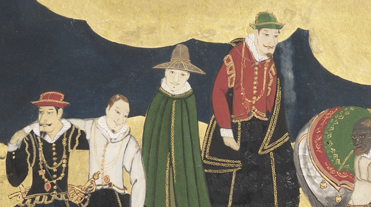 荒木:ところで《南蛮諜影録》に登場している南蛮屏風は前々からとても好きな作品で、《ANGELO LIVES》と言う過去作でも、同じイメージが登場しています。今回ポルトガルの国立古美術館で実物と対面できたときは本当に感激しました。同時に、これほど重要な優品が日本ではなく海外に所蔵されているという事実にも、ある種の衝撃を覚えたわけですが…。そもそも、なぜ南蛮屏風にこれほど惹かれているのかというと、呼称自体にも表れていますが、外から来た異質な存在として相手を位置付けながらも、同時に強い関心をもって筆を尽くしている。他者を受け入れながらもしっかり観察している、この異様ともいえる視線のねじれが非常に面白くて魅力的です。在外研修の調査もあり、屏風をじっくり見ていたのですが、ある瞬間、目が合ってしまったんですね。真正面を向いてこちらを見返してくる人物と。先ほどお話しした、第四の壁とも通じますが、美術史では《ラス・メニーナス》のように、画面のこちら側を見る眼差しには、しばしば特別な意味があると論じられています。この眼差しはいったい誰に、何に向けられているのか。そう考え始めた時、イメージが大きく動き始めました。