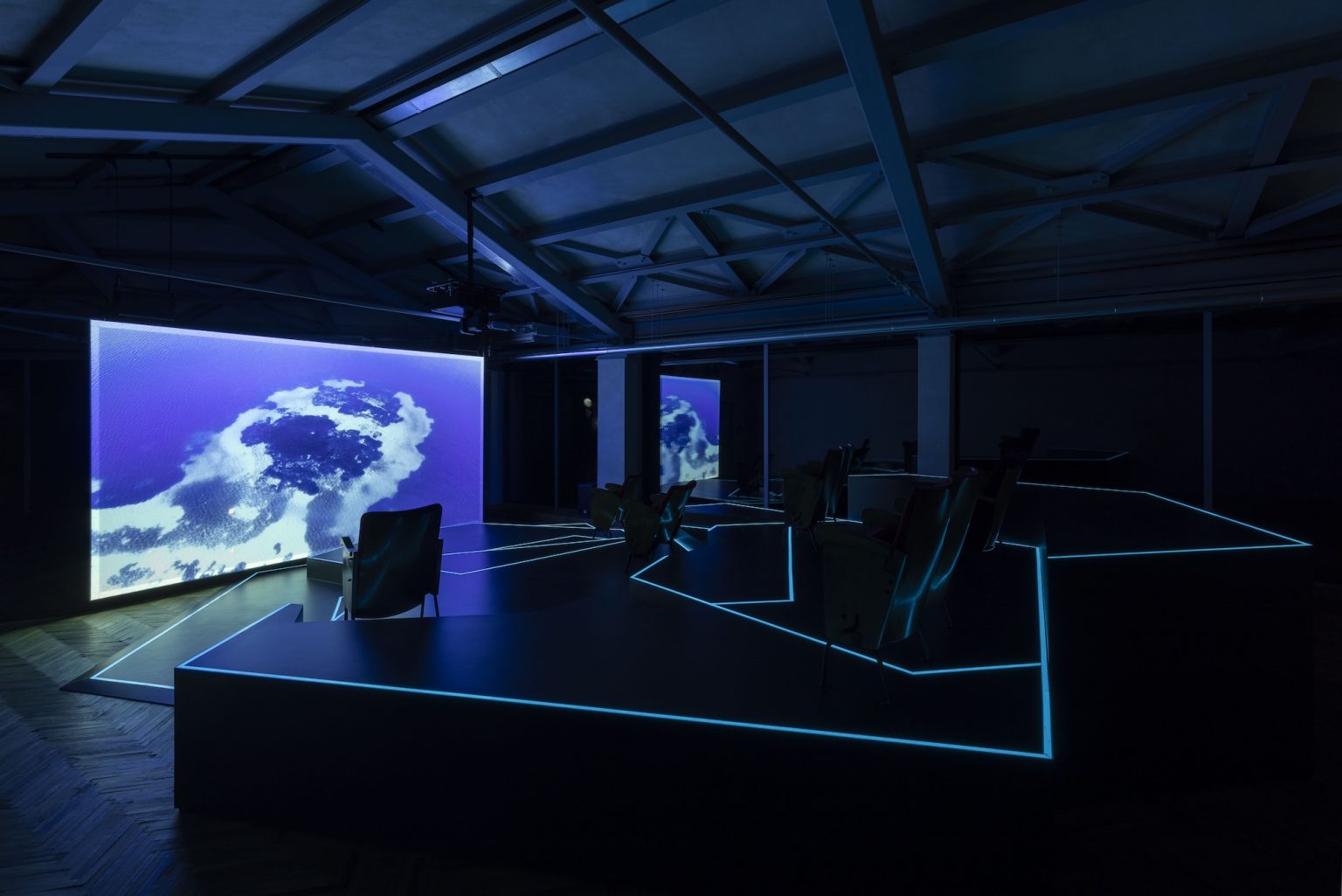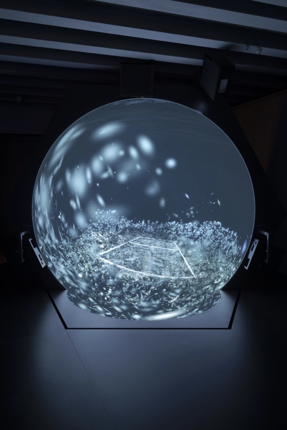 展示空間の別の一角では、量子物理学という主題が、ローテクにもハイテクにも見える彫刻作品として再び現れる。ギャラリー内では、発光する巨大な二つの凹型の投影球体が来場者を迎え、その内部にはコルチュラと水中の考古学遺跡をめぐるシミュレーション映像が繰り返し映し出される。そこに現れるのは、きらめく量子粒子を思わせるCGIの人工的な生成像である。《The Island》の投影スクリーンの奥には、金属と流木で組まれた2mを超える骨組み構造が現れ、終末後の世界の天文観測器を思わせる。半透明の半球状ドームが固定されたその構造体の内部では、コルチュラと水中遺跡の像が明滅しながら渦を巻く。また円環状に配置されたビデオスクリーンでは、作品に登場する語り手たちへのインタビューの長尺版が上映され、映像内で断片的に提示される発言がここで拡張され、より広い文脈のなかへと位置づけ直されている。