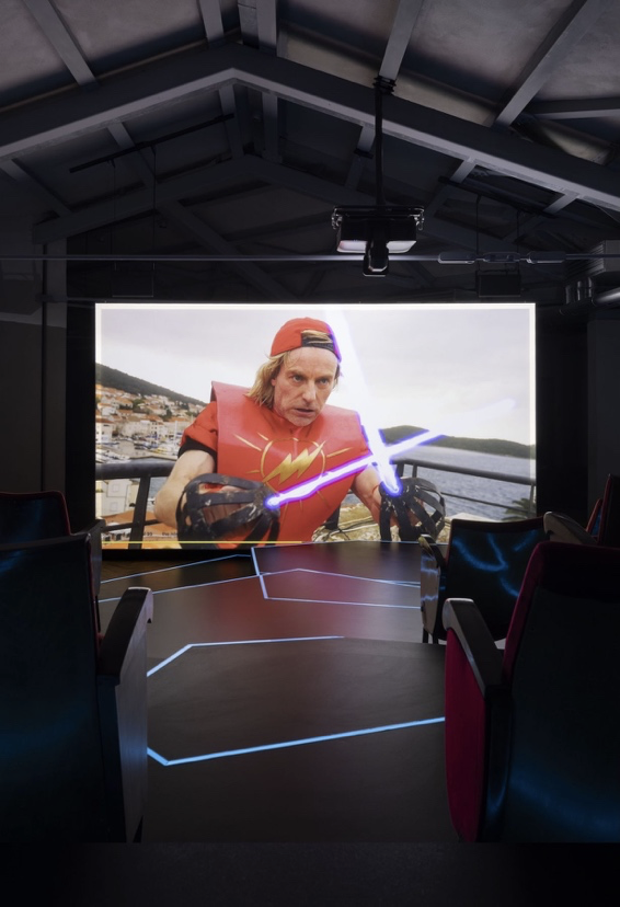 新作展「The Island」の会場となるプラダ財団のペントハウスギャラリーでは、その暗転した内部に映像作品とビデオスカルプチャーが設置されている。床面には映画『トロン』を思わせる青い発光ラインが走り、来場者を誘導する。本展は、同名の荒唐無稽な映像作品《The Island》を中心に展開している。そこには、1980年代の映画から抜け出してきたかのような『フラッシュ・ゴードン』のアバターがコミカルな主人公として現れ(ドイツ人俳優マルク・ヴァシュケが愛嬌たっぷりに演じている)、絵はがきのように美しいクロアチアの島町コルチュラの街路を舞台に、「世界を救う」べく奔走する。コルチュラという場所の選択には、クロアチア出身のSF史家ダルコ・スーヴィンの存在が関わっているだけでなく、沖合で発見された、新石器時代にさかのぼる人為的な人工島遺構の物語にも結びついている。第二次世界大戦期の幼少時代について語るスーヴィンの回想は、AIで生成された映像やフラッシュ・ゴードンの冒険場面のあいだに織り込まれていく。こうした要素が重なり合うことで、この場所にはさらに複層的な意味が付与されている。