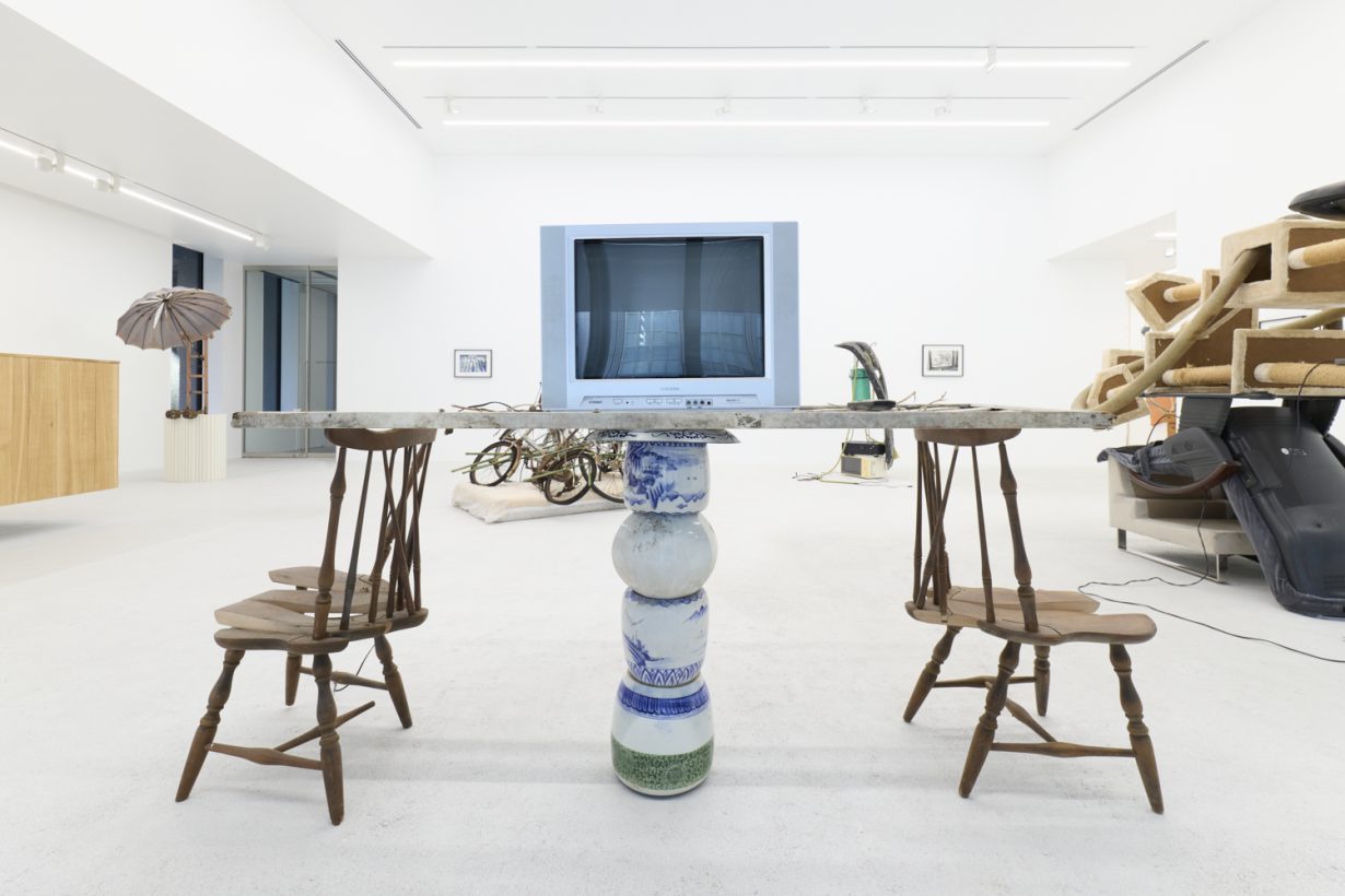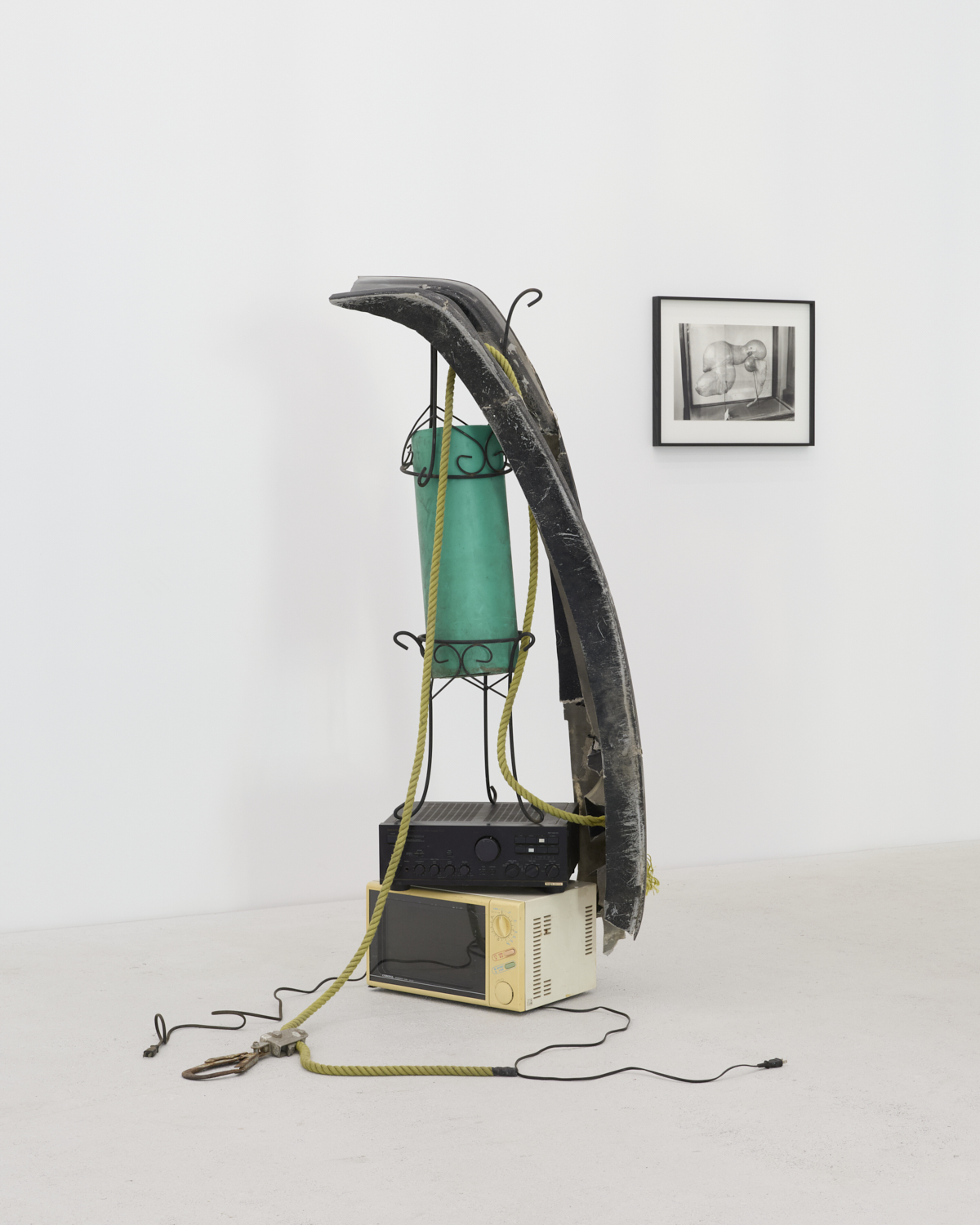 この非同期的な時間の感覚は、セル・セルパスの作品において身体のあり方と密接に結びついている。造形から詩、パフォーマンスに至るメディアを横断するセルパスの立体彫刻は、都市の廃棄物といった消費の残滓を重ね合わせ、自身の即興的な身体を介在させながら再構成される。本展における彫刻も、日本で廃棄された事物を取り込みながら組み立てられた。それらは重力や接触に依存した不確定なバランスの上に置かれ、崩壊の可能性を内包したまま持続する。その関係のなかで、構造体は分離と接続のあいだに留まりながら、身体の延長として立ち上がる。