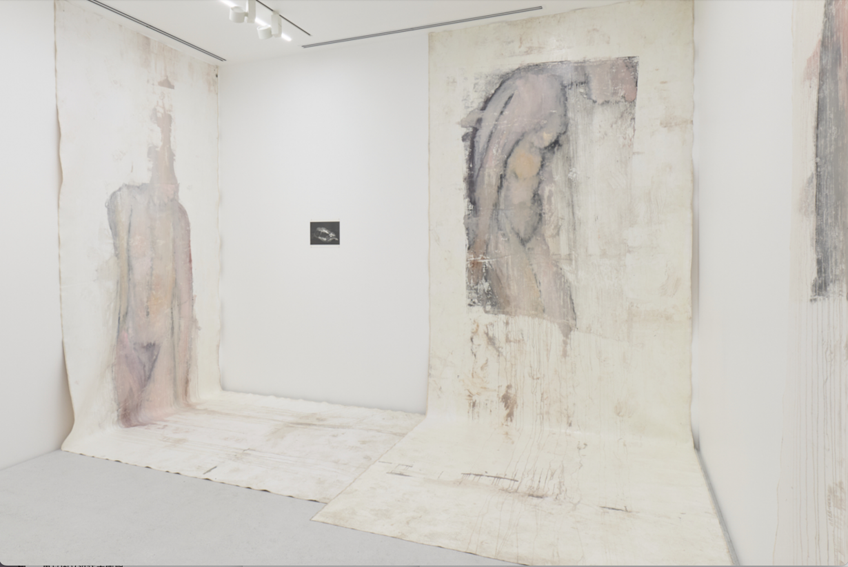 真っ白な展示空間の床に点在する重ね置かれた断片的な構造体。その異形な接続と質量を取り囲む壁面には、遺物を切り取ったような白黒の写真が配置されている。奥の部屋では、キャンバス地が剥き出しになった絵画が壁の上部から地面へと重力に引かれるように垂れ下がり、滲み出す淡い肌色の色面と曖昧な輪郭が、風化した壁画のようにその場に留まり続けている。